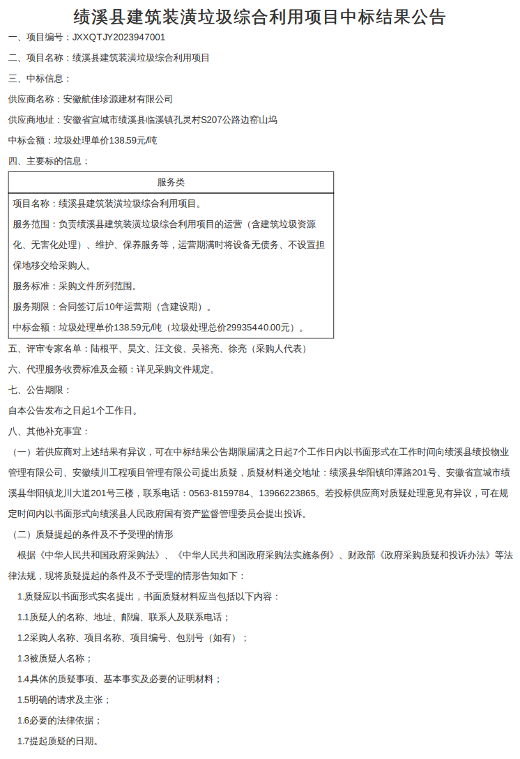 安徽省績溪縣建筑裝潢垃圾綜合利用項目中標結(jié)果公告,安徽航佳珍源建材有限公司中標,中標垃圾處理單價138.59元/噸,服務期限10年,含建設期,公示如下: